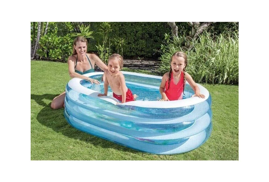 Dit ovale Intex opblaasbaar zwembad zorgt voor verkoeling op warme dagen. Het bad bestaat uit 3 ringen en een comfortabele, opblaasbare bodem.